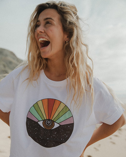 Channel your inner starchild and roll slow. The Cosmic Eye Tee is made from 100% organic cotton with a relaxed boxy fit, wide neckline and easy rolled sleeves. Soft and lightweight at 165gsm, it’s the kind of tee you reach for when the sun’s out and the day’s wide open.